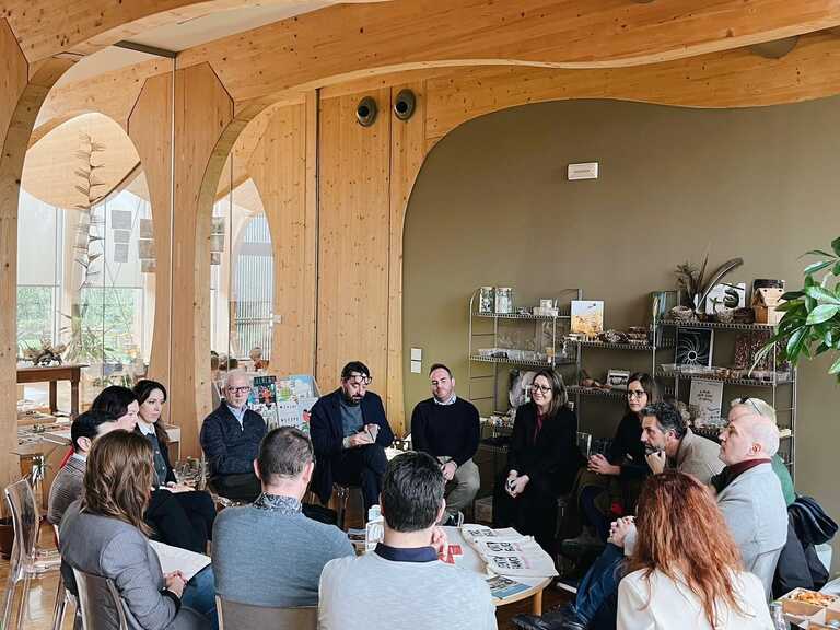 La delegazione si è poi spostata al Nido d’infanzia Iride, una struttura che ha già fatto parlare di sé a livello internazionale per il progetto dell’architetto Mario Cucinella dopo il sisma del 2012, da molti definito “l’asilo più bello del mondo”. Nei suoi 1.400 metri quadrati, che ospitano 120 bambini (0-3 anni), l'architettura dialoga costantemente con la pedagogia. Qui lo spazio è concepito come "terzo educatore", dove luce, colori, materiali naturali e tecnologie diventano parte integrante dell’esperienza educativa, in un ambiente ecosostenibile e sicuro. Proprio tra queste pareti di legno e vetro si è tenuto un confronto con i sindaci degli otto comuni della Bassa Reggiana, i consiglieri regionali Elena Carletti e Andrea Costa e i vertici di ASBR, l'azienda che dal 1988 coordina i servizi educativi 0-6 anni e il welfare territoriale. Il dialogo, focalizzato sulle sfide attuali e future, ha confermato il valore di un progetto pedagogico studiato a livello internazionale.