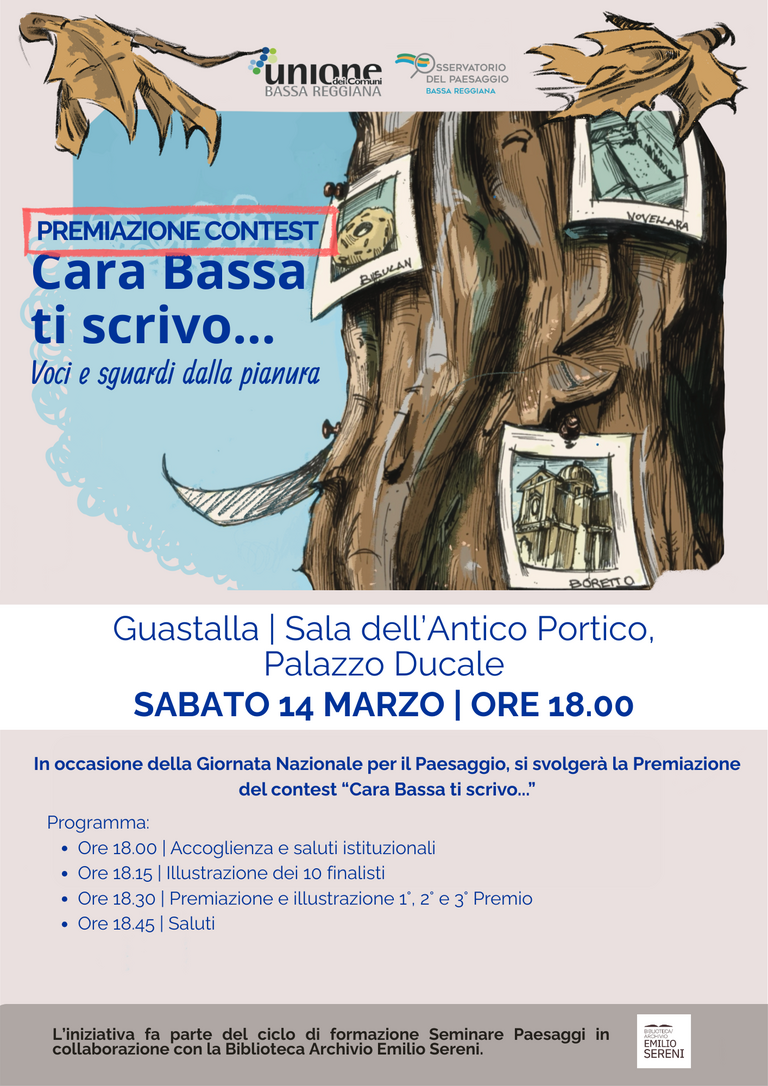 In occasione della Giornata Nazionale per il Paesaggio, si svolgerà la Premiazione del contest “Cara Bassa ti scrivo...”, iniziativa promossa dall’Unione dei Comuni Bassa Reggiana, in collaborazione con la Regione Emilia-Romagna, che nasce per dare vita alle “Mappe di Comunità”, il percorso partecipato che ha censito i luoghi dell’anima del territorio. L’obiettivo è valorizzare l'identità della pianura, partendo dagli elementi emersi durante i laboratori partecipativi svolti sul territorio.