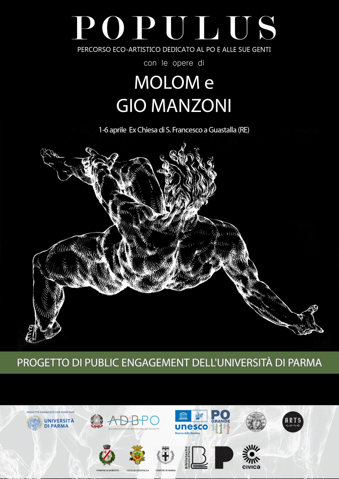Populus vanta il patrocinio dei Comuni di Guastalla, Boretto e Parma e il supporto dell’Autorità di bacino distrettuale del fiume Po, in veste di Segreteria Tecnica Operativa della Riserva MAB UNESCO Po Grande, è affidato ai due artisti Gio Manzoni e molom (Milena Berta e Alessandro Pedretti), e prevede la realizzazione di eventi artistici, con esposizioni di opere realizzate ad hoc, e momenti didattici e divulgativi sulle metamorfosi del Po nel contesto della crisi climatica e del collasso della biodiversità.